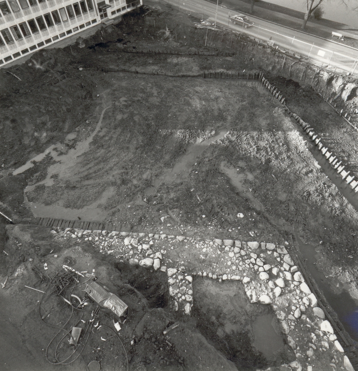 Arkeologisk utgrävning inför byggandet av nya landstingshuset. Bastionen Carolus Nonus och en del av pålverket, sett från ovan.