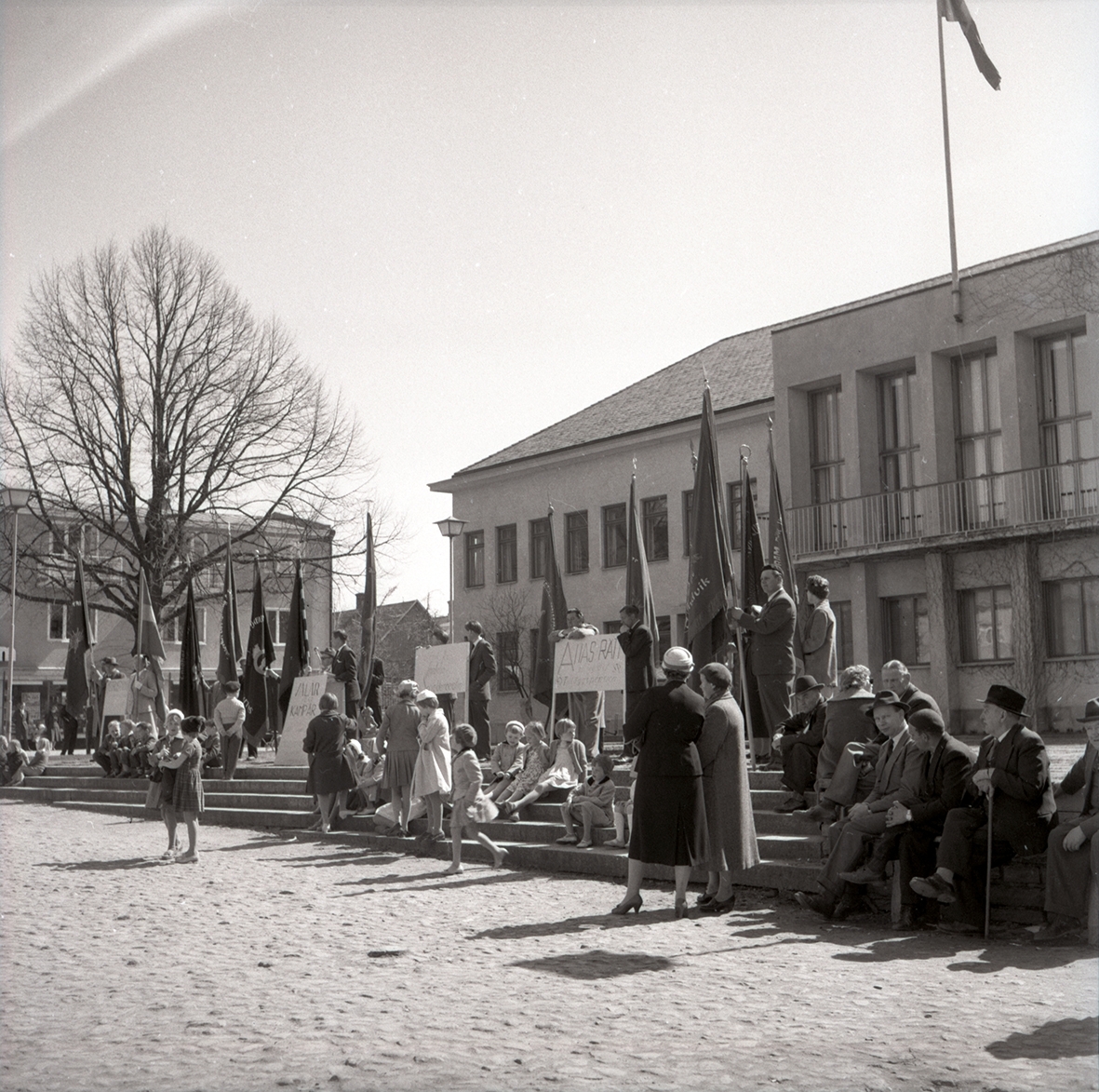 Första majfirande vid Borgholms stadshus. Allas rätt till allmän tilläggspension propagerades det för detta år.