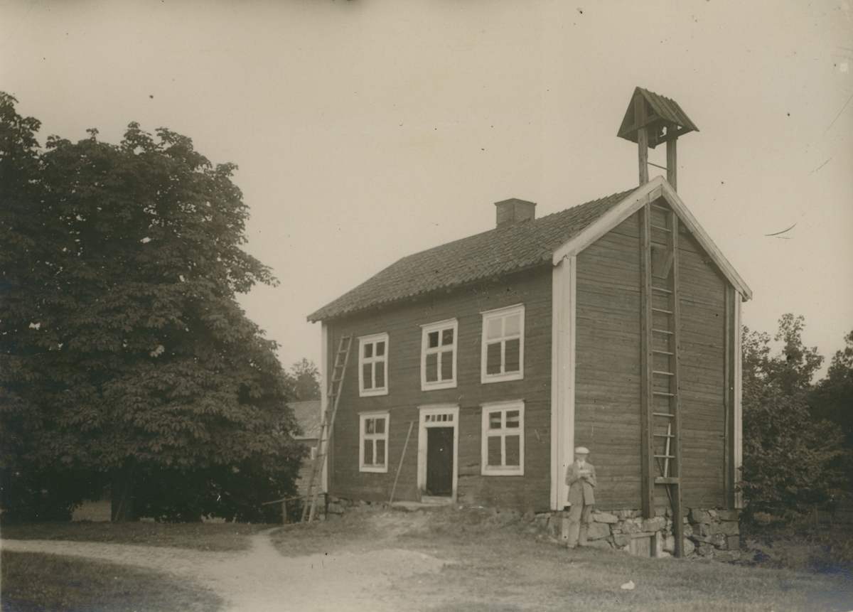 Fagerhults herrgård, med västra flygeln av timmer i två bottnar. Den är röd med vita foder och knutbräde, och är försedd med vällingklocka. i bakgrunden syns ladugården.