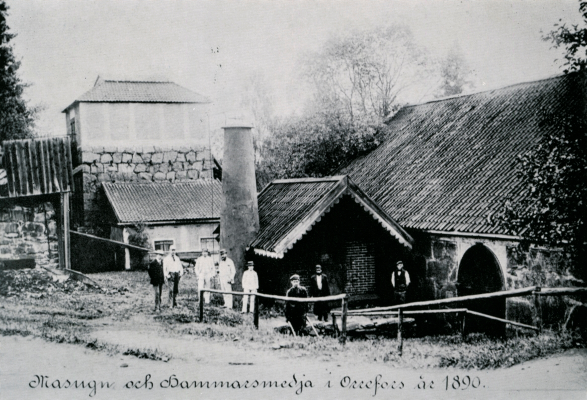 Vykort som visar masugnen och hammarsmedjan i Orrefors, 1890.