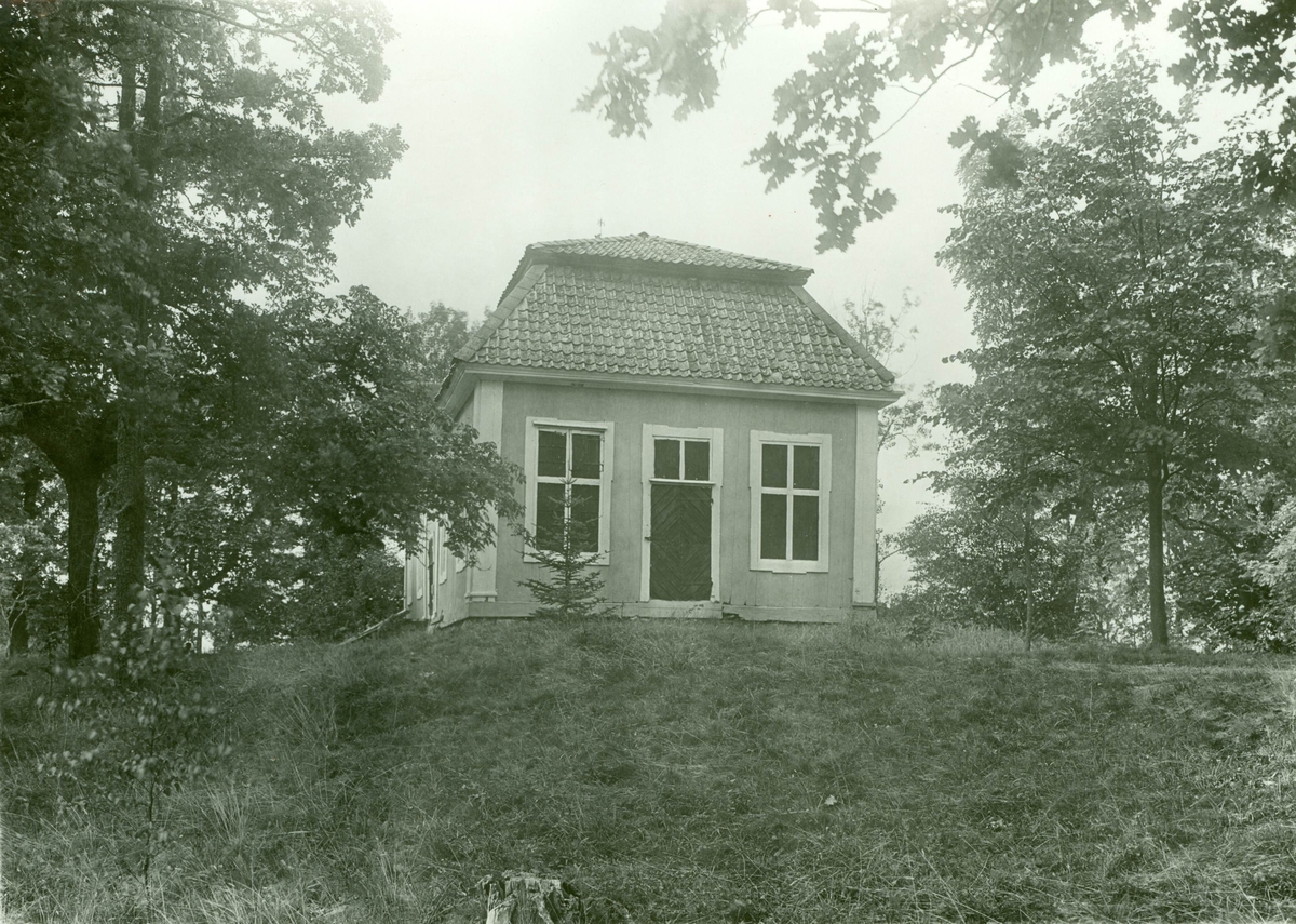 Av timmer med slätpanel. Gul målning med foder och pilastrar i vitt, dörrar och luckor i svart. Taket täckt med gammalt svart tegel. Flöjel med rikt smidd spira av 1600 talsform, i flöjeln årtalet 1744 (74?). Den gamla inredningen borta (enl. uppgift).