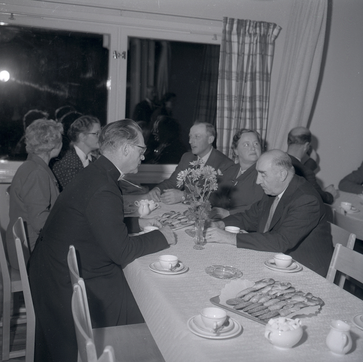 Invigning av hembygdsgården i Köpingsvik. Människor som dricker kaffe. Troligen Ivar Persson till höger.