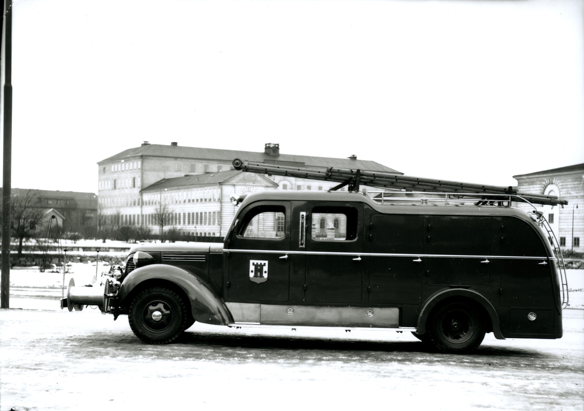 Brandkåren i Kalmar, brandbil med pump och stege framför brandstationen.