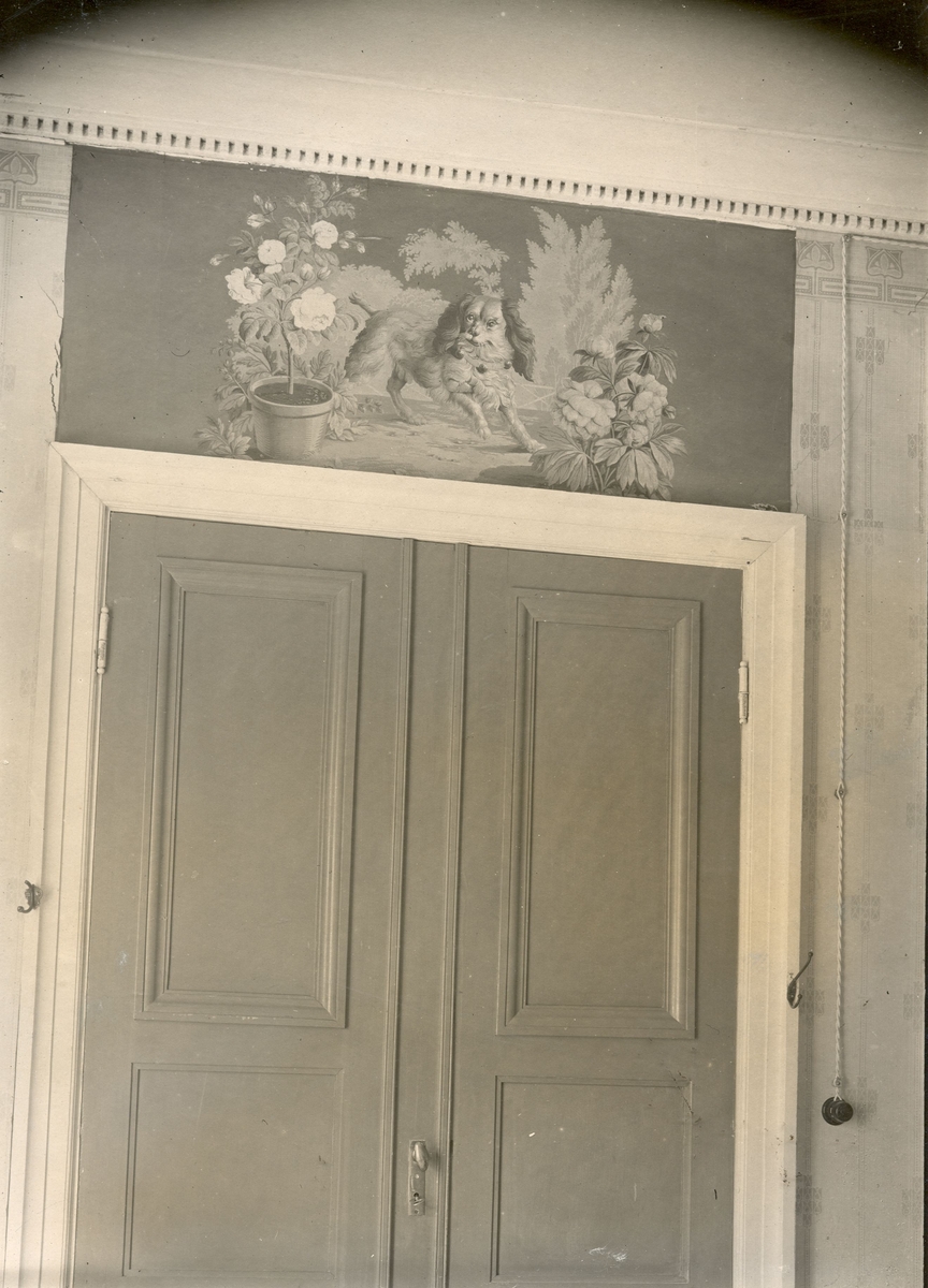 Övervåning, rum fem. Dörröverstycke av tryckt papperstapet i färger, möjligen Arthur & Robert.