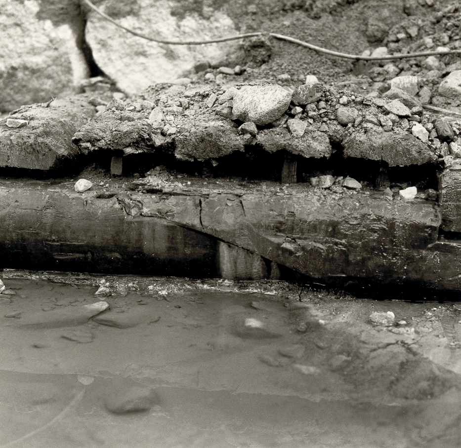 Arkeologisk utgrävning inför byggandet av nya landstingshuset. Bastionen Carolus Nonus. Detalj av bastionens underliggande träkonstruktion - "plankgången". Notera träpluggar och sammanfogningen av de två underliggande stockarna.
