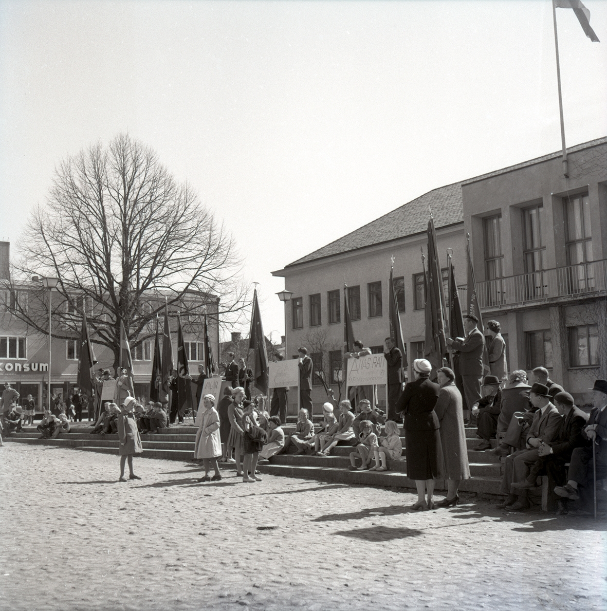 Första majfirande vid Borgholms stadshus. Allas rätt till allmän tilläggspension propagerades det för detta år.