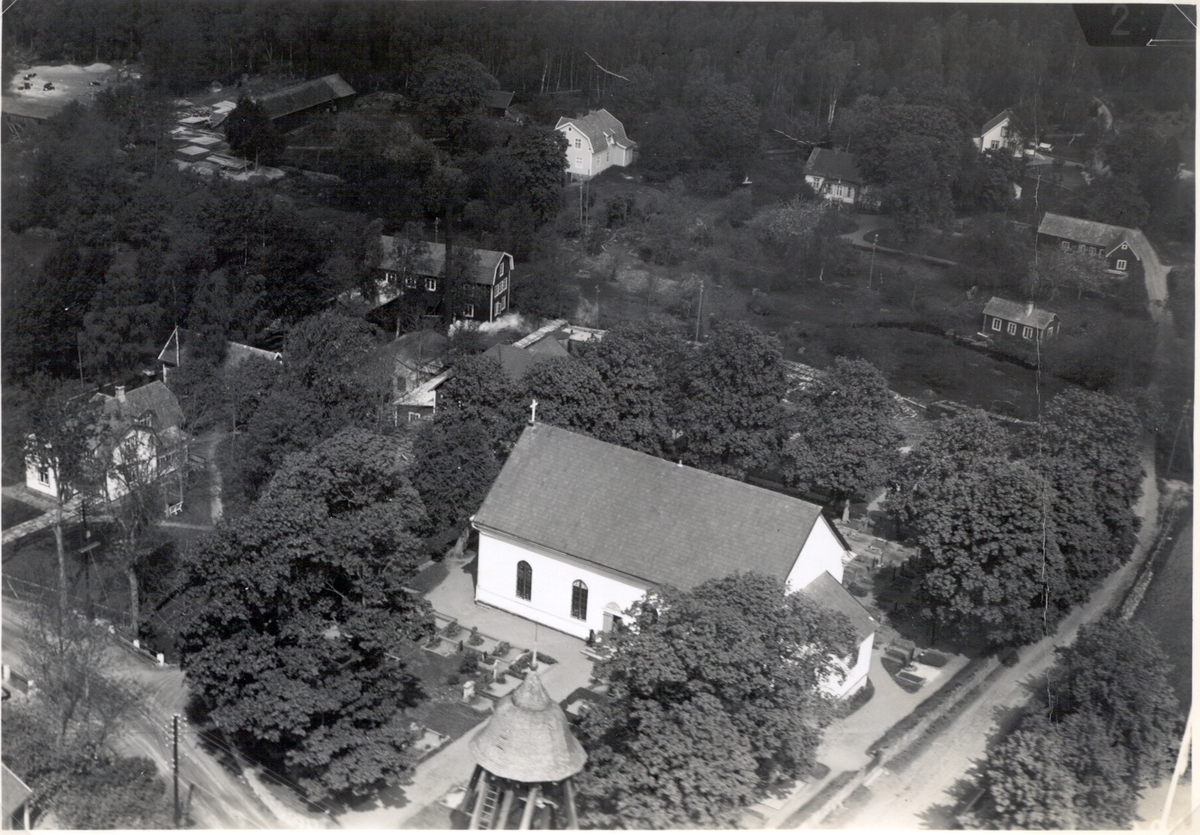 Flygbild över Karlslunda kyrka och kyrkogård i Påryd från sydost. I förgrunden syns klockstapelns huv.