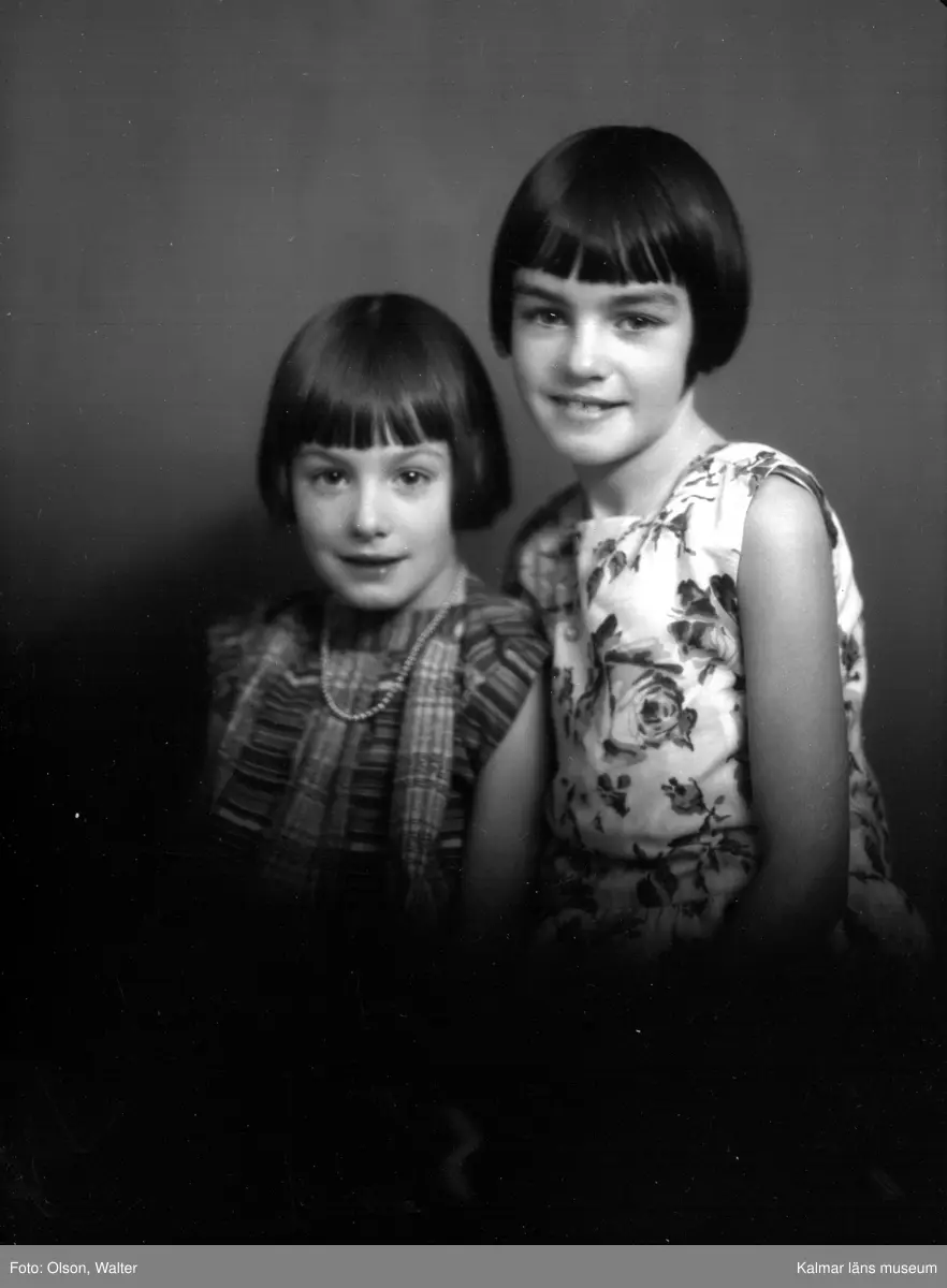 Porträtt av två flickor i ateljé. Enligt Walter Olsons journal är bilden beställd av fru Rut Karlsson ifrån Kylegatan 6 i Kalmar.