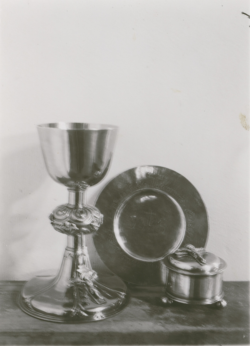 Slottskyrkans altarsilver, förvarat på annan plats. Kalk daterad 1685. De övriga delarna samtida med kalken. Mästarstämpel (Hans Olofsson Sturk). Paten i förgyllt silver. Krucifix, kalk och oblatask är oförgyllda.