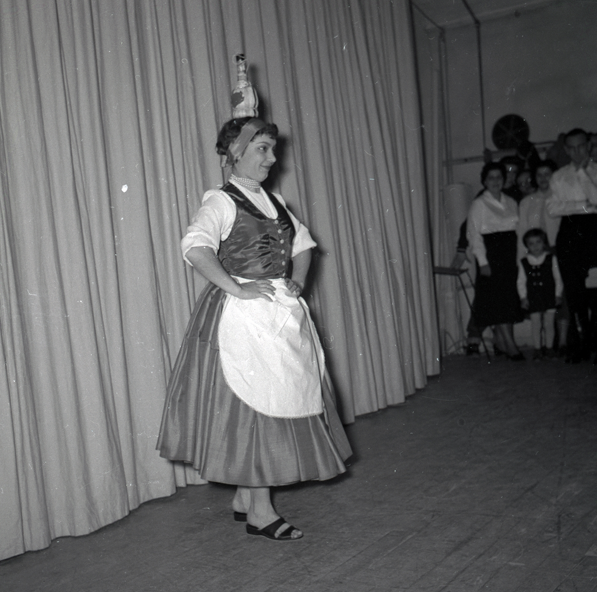 Bild tagen i samband med flyktingar ifrån Ungern 1956. En kvinna på scen i traditionell romsk folkdräkt i Godtemplargården hösten 56 - våren 57.