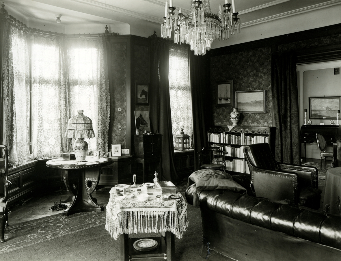 Salong på Bergagården med fåtölj, soffa, bord, bokhylla och kristallkrona.