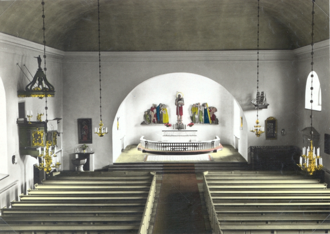 Interiör av Söderåkra kyrka. Kolorerat vykort.