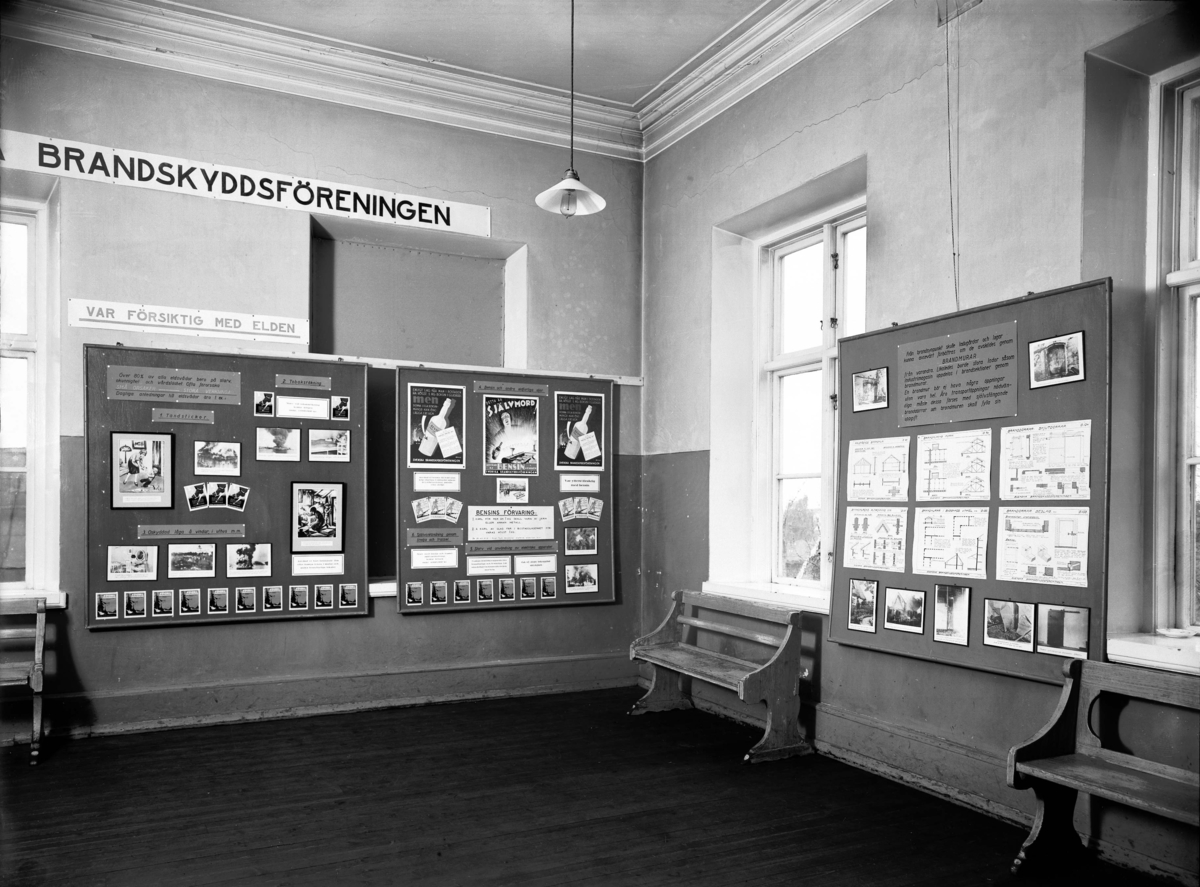Informationstavlor om brandskydd vid en utställning av Svenska brandskyddsföreningen.