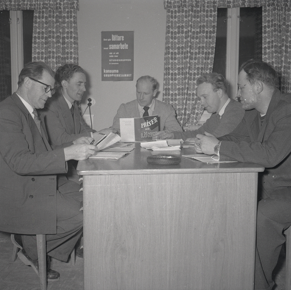 En studiegrupp. Text på plakat: "Det går lättare med samarbete när vi vill veta mer STUDIEGRUPPEN är [text oläslig] konsums GRUPPVERKSAMHET".
