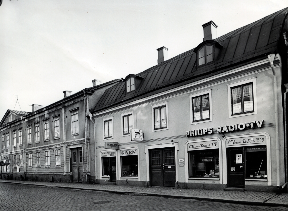 Apotekaren 8 till vänster på bilden. Fastigheten jämte intilliggande Storgatan 30 rivna 1964 för Skandias nybyggnad.