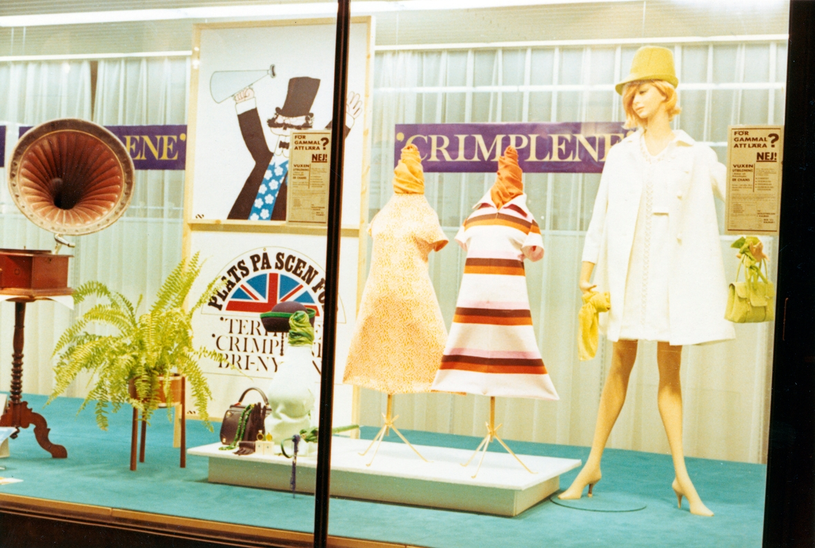 Skyltning med damkläder av crimplene, i Domus fönster i Kalmar, 1968.