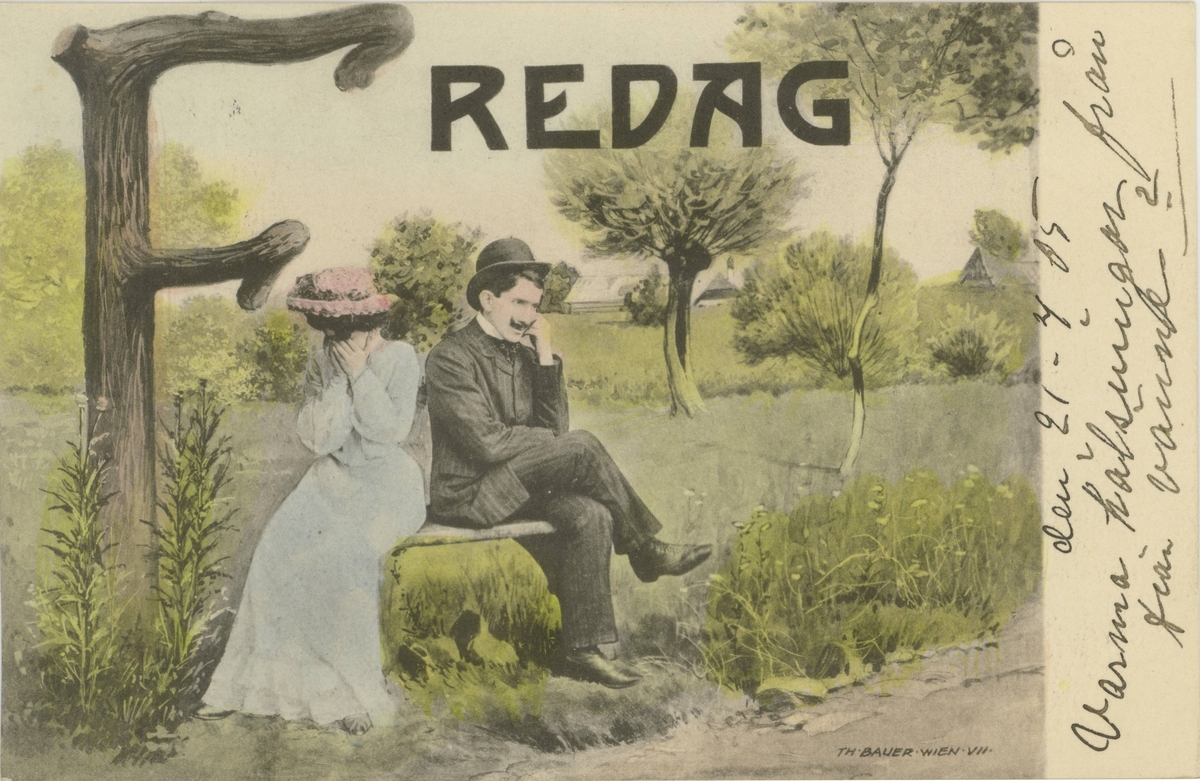 Ett tecknat, så kallat veckodagskort - fredag - föreställande ett par på en parkbänk. Paret på kortet tycks vara ovänner.