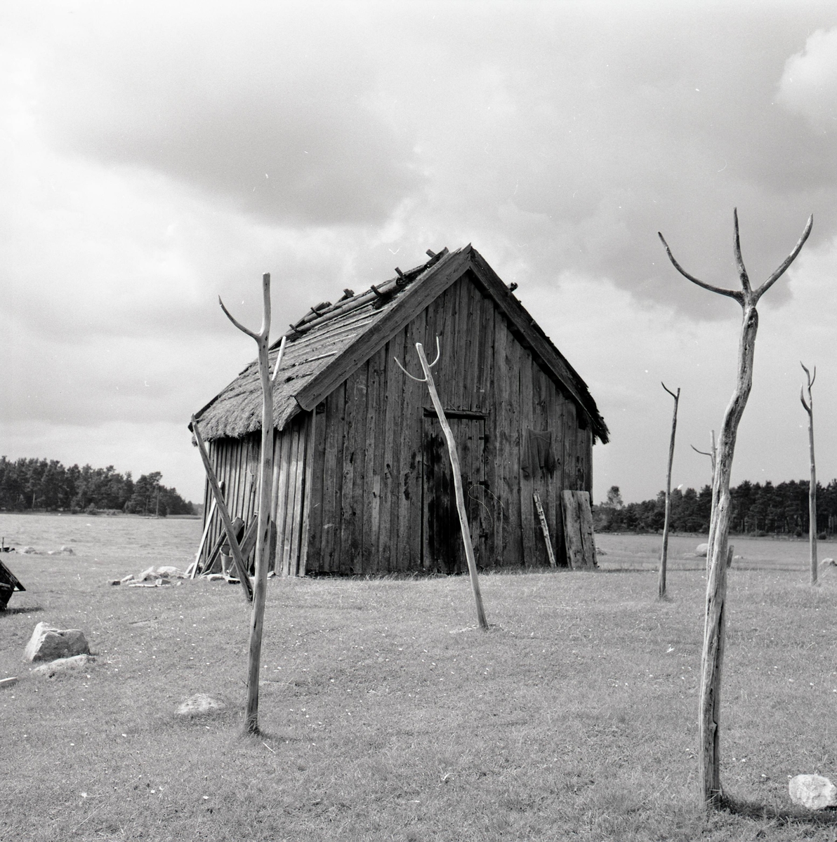 Elias Gustavssons sjöbod med nätspetor i förgrunden.