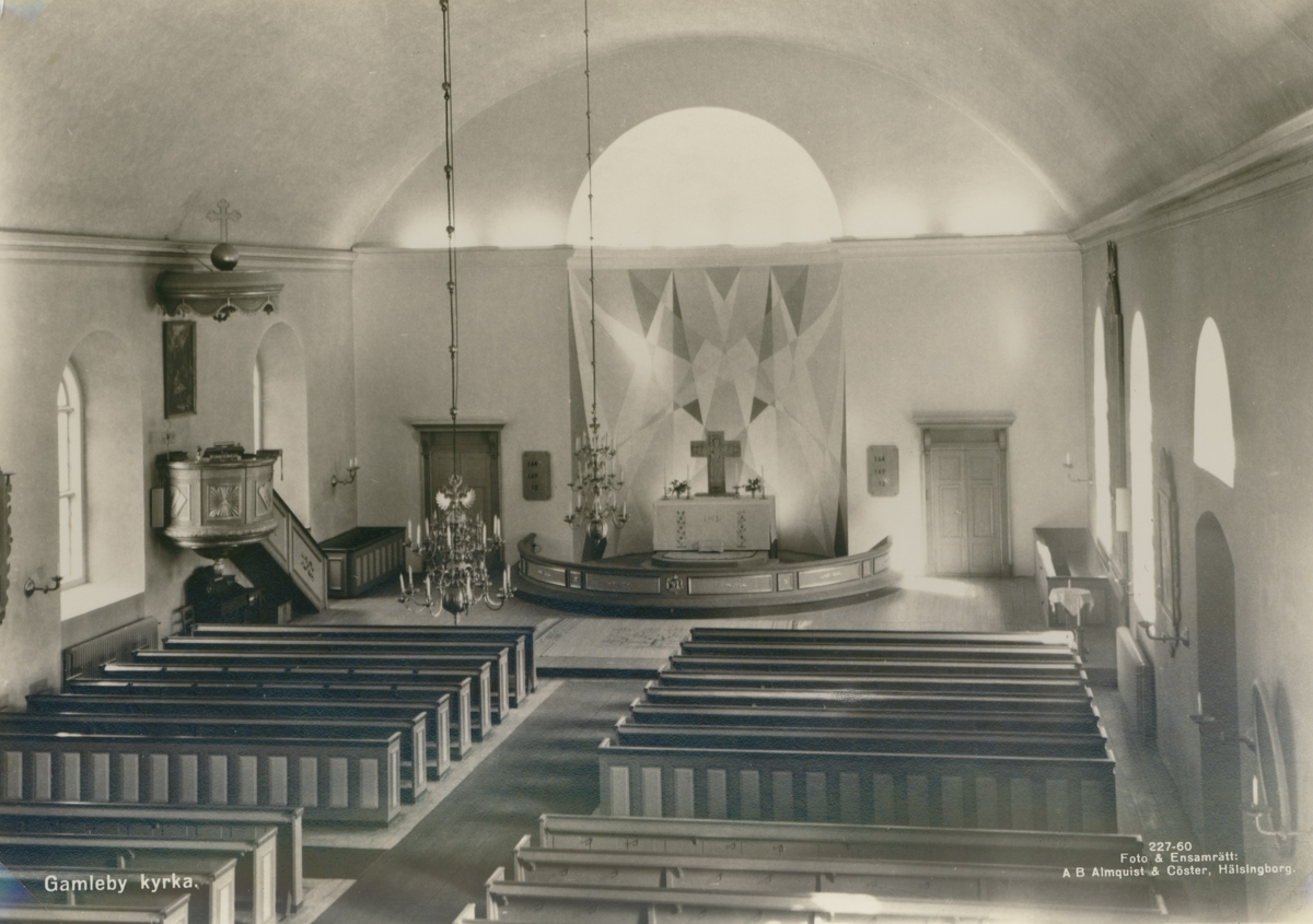 Interiör från långhuset mot altaret i Gamleby kyrka.