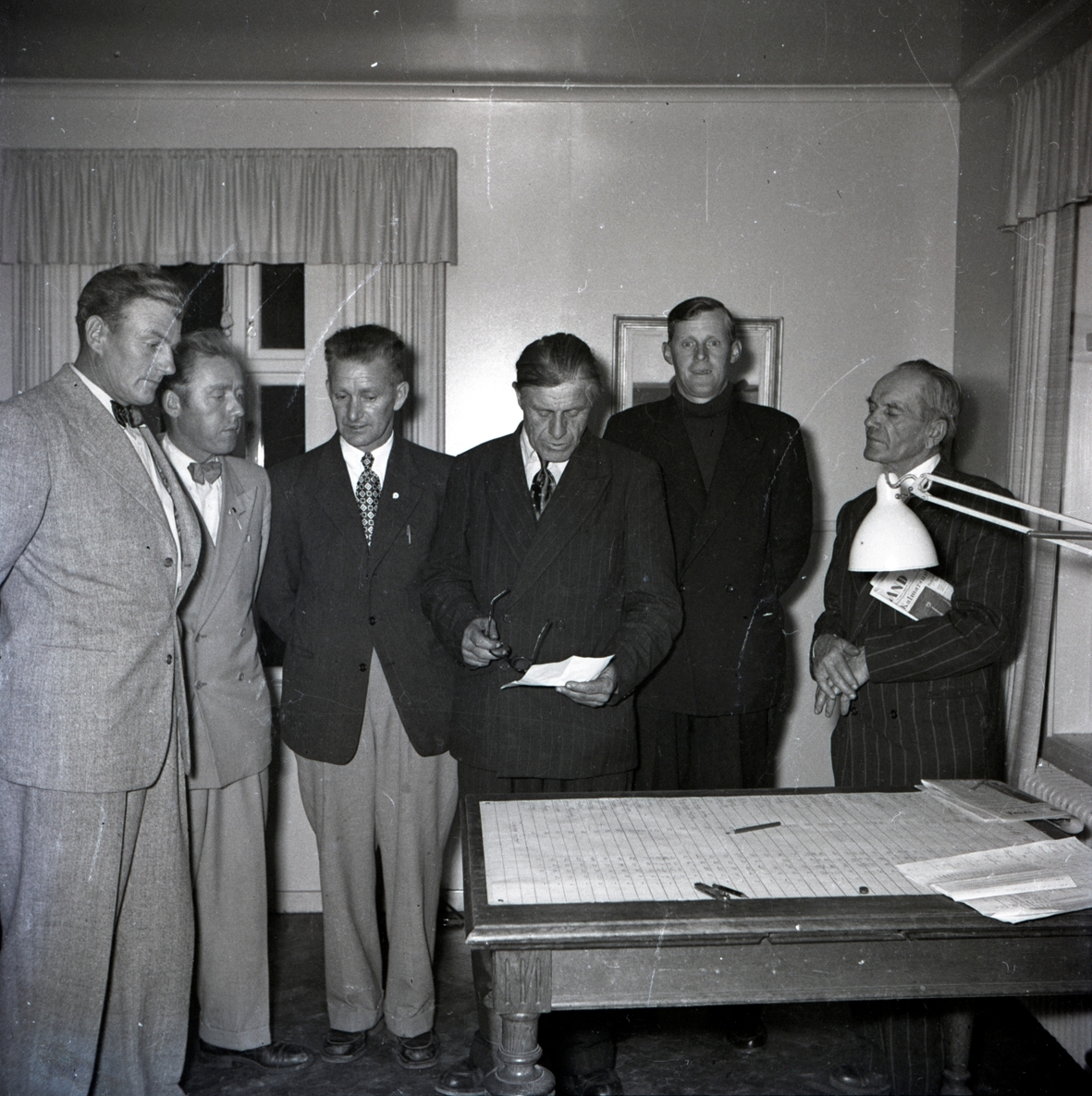 Valet 1954. Bror Hellberg, Bror Svensson, Albin T. Forsman och valarbetare.