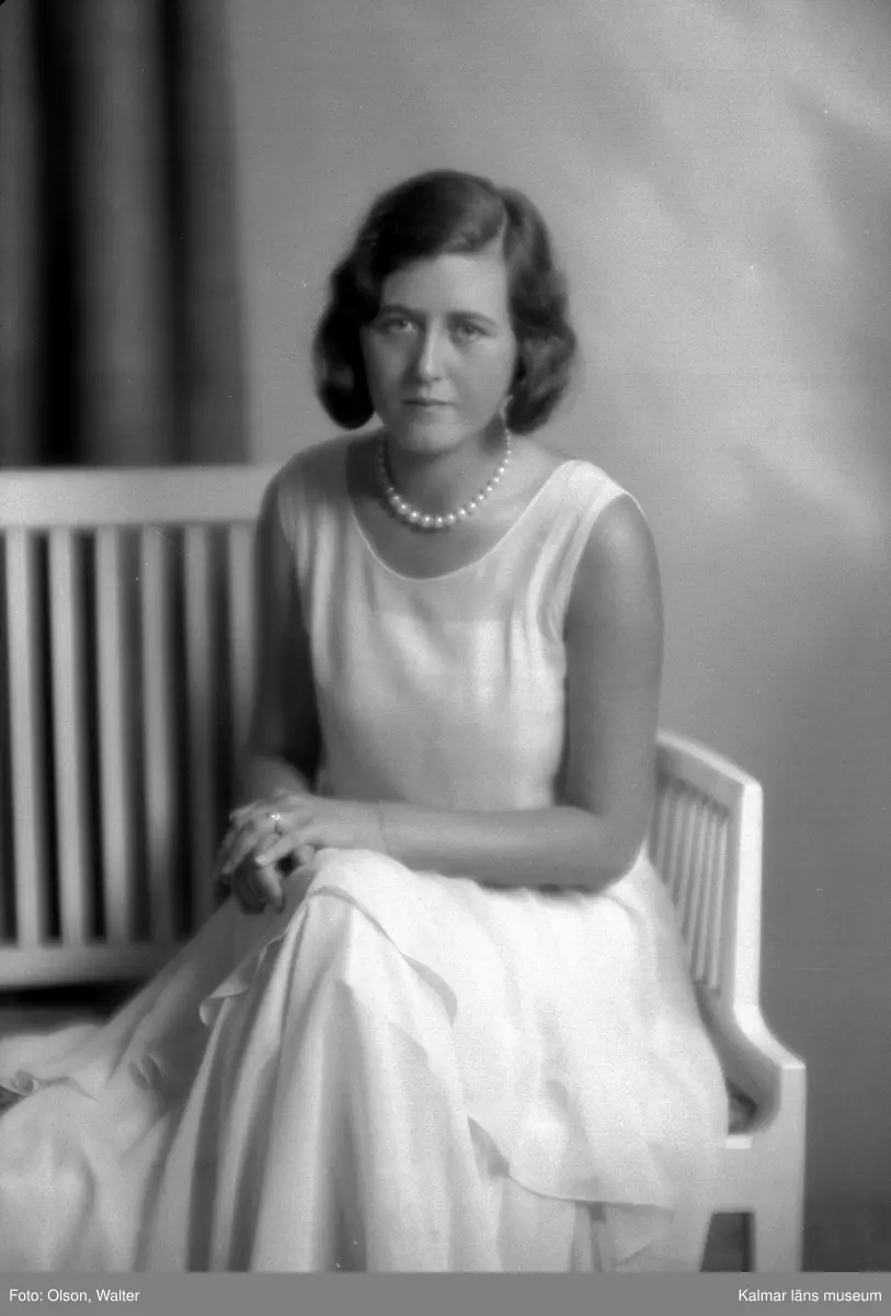 Porträtt på kvinna i aftonklänning. Enligt Walter Olsons journal är bilden beställd av fröken Majken Johansson ifrån Norra Vägen 19.