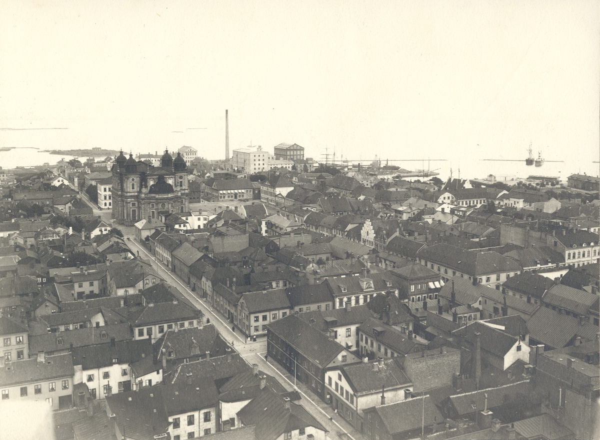 Vy över Kvarnholmen från det då nybyggda vattentornet. Norra Långgatan leder i bildens mitt mot Domkyrkan. Vid Stortorget är de flesta byggnaderna ännu bevarade, men Stadshotellet avlöste Svanfeldts hotell 1906, I bildens övre högra hörn syns Ångkvarnen med sin skorsten.