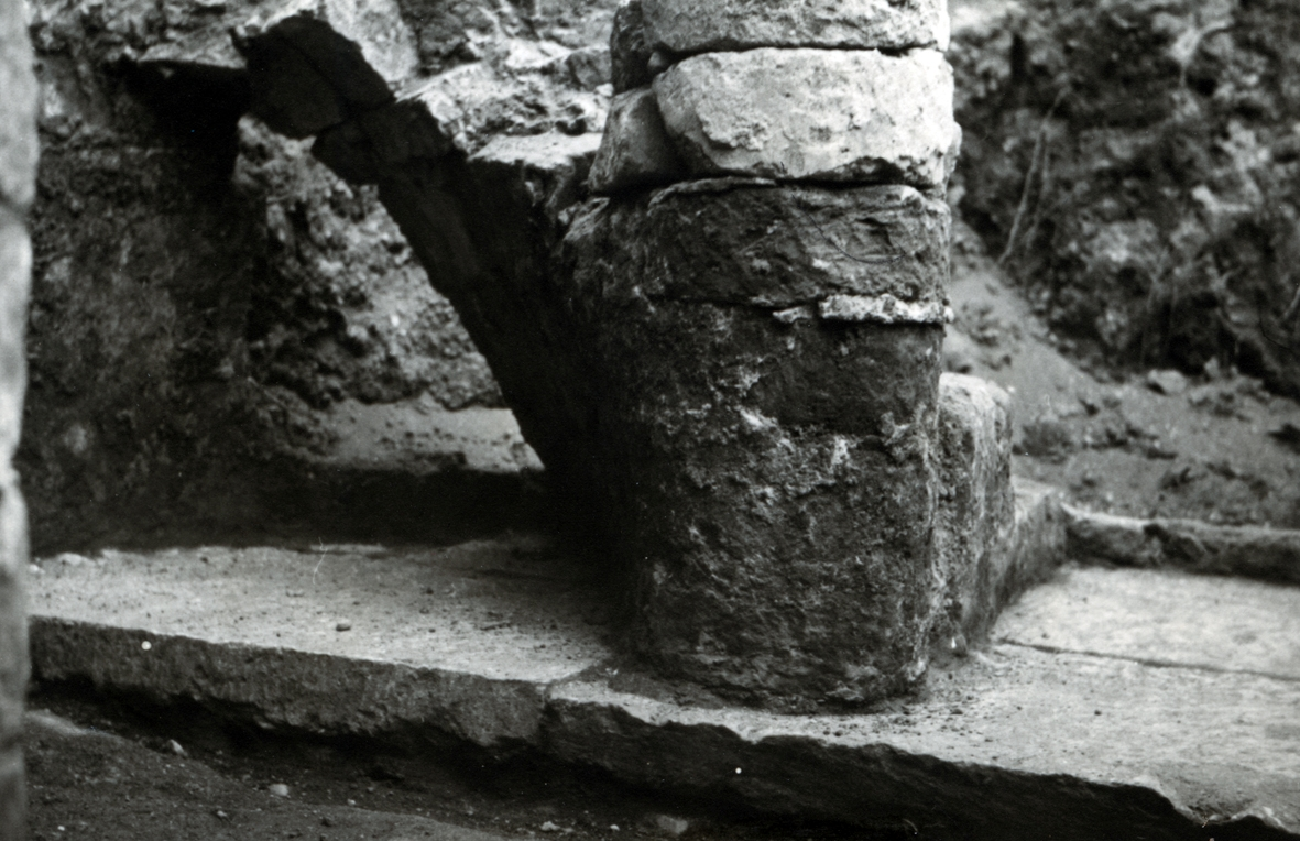 Den här bilden visar fynd av trappa strax innanför gamla grinden vid vaktmästarebostaden 1942.