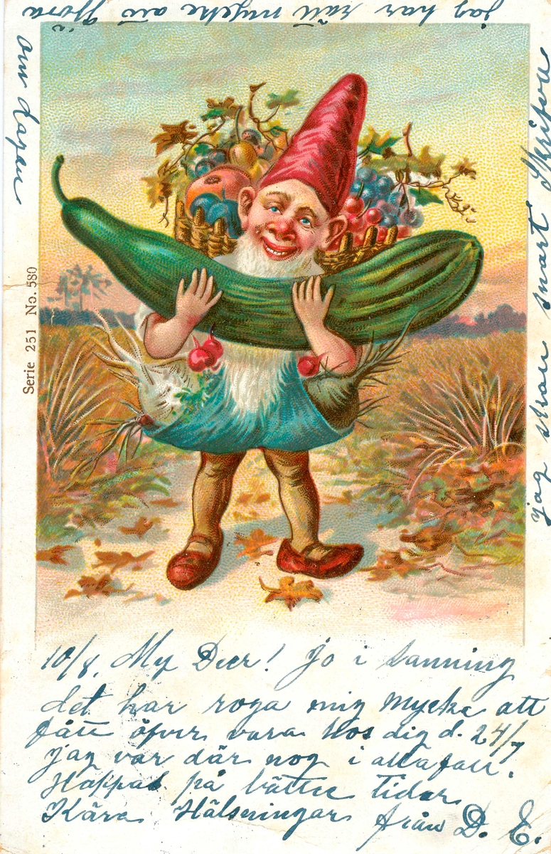 Vykort skickat till Kristina Andersson, född 1865 i Böda, syster till N J Andersson, när hon bodde i USA. Det är skrivet av Edvard Nilsson i Böda. Skriven text: "10/8 My Dier! Jo i sanning det har ... mig mycke att fått öfvervara hos dig den 24/7 Jag var där nog i alla fall. Hoppas på bättre tider. Kära hälsningar från D E. Jag skall snart skrifva. Jag har rätt mycke att göra om dagen." Anmärkning: Vätten kan ses som en tolkning av den grekiske fruktbarhetsguden Priapos.