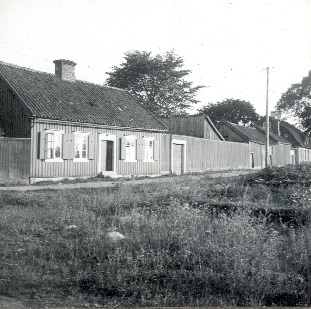 Krusenstiernska. Bostadshus med sadeltak och träfasad samt plank.