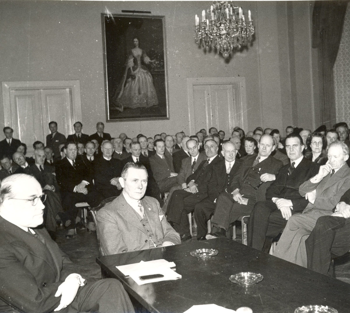 På fotots baksida: Hantverksföreningen i Kalmar. Sittande vid ? från vänster ryttmästare Birger Jeansson och juvelerare Hentzell. Från höger första raden musikhandlare Hammert, direktör Söderlund, KVAB, tredje man från honom är tapetserarmästare Rundblom.