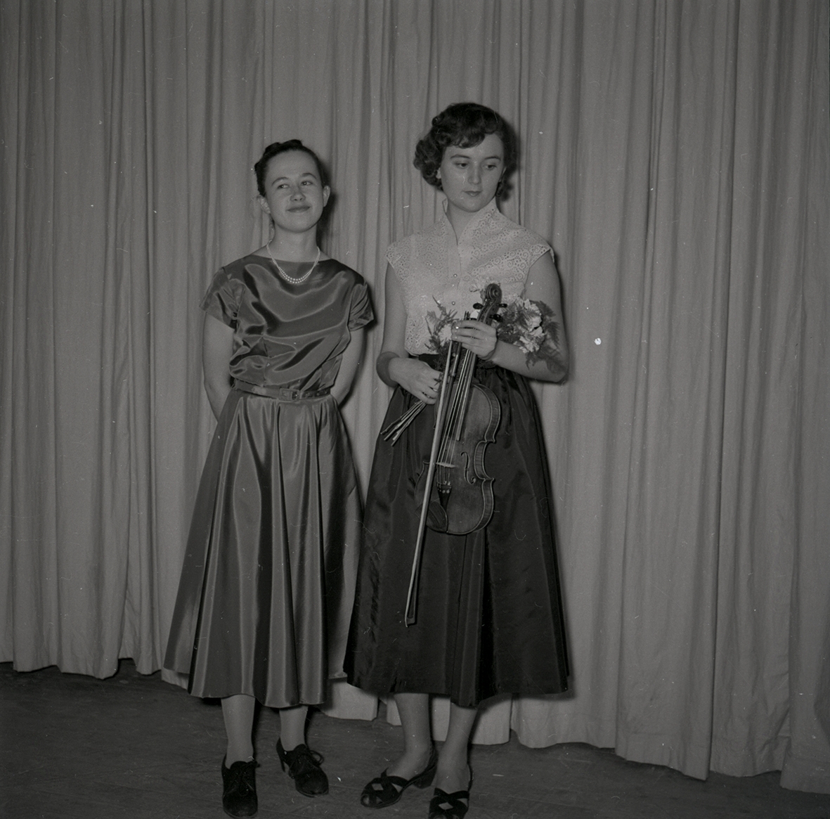 Bild tagen i samband med att flyktingar ifrån Ungern kom 1956. Två kvinnor som står på scen. Den ena kvinnan håller i ett stråkinstrument i Godtemplargården hösten 56 - våren 57.