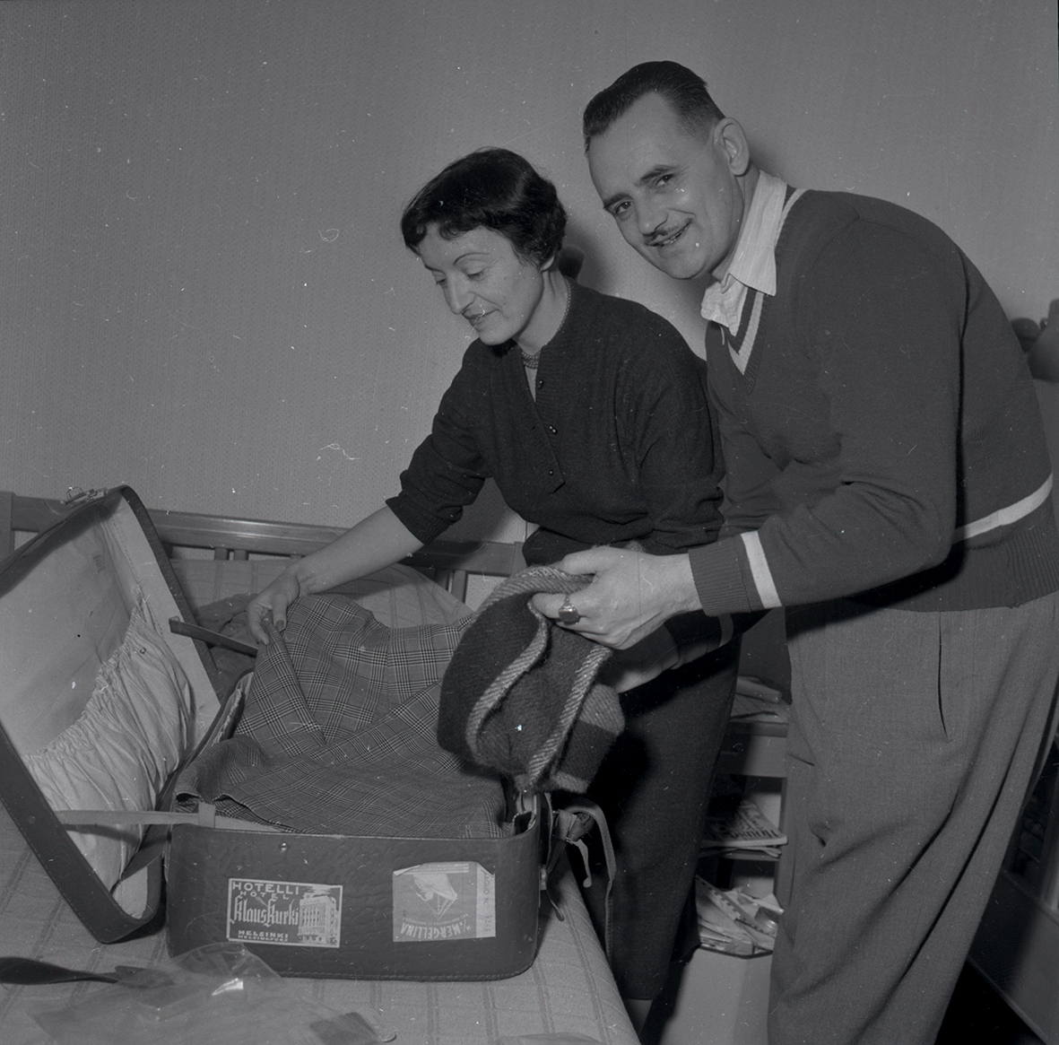 Bild tagen i samband med att flyktingar ifrån Ungern kom 1956. En man och en kvinna som packar eller packar upp. Hösten 56 - våren 57.