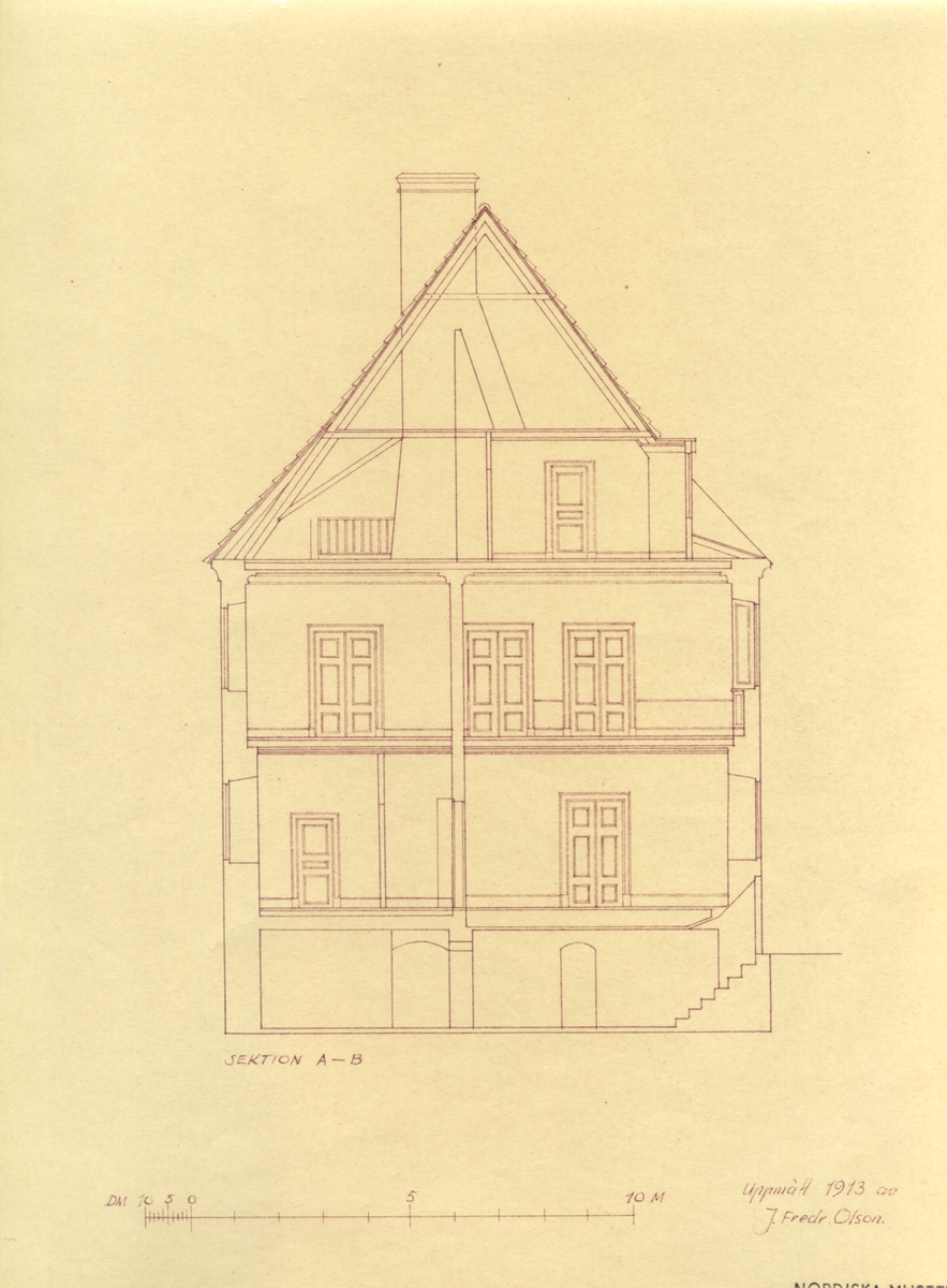 Ritning över Dahmska huset i genomskärning (sektion A-B).