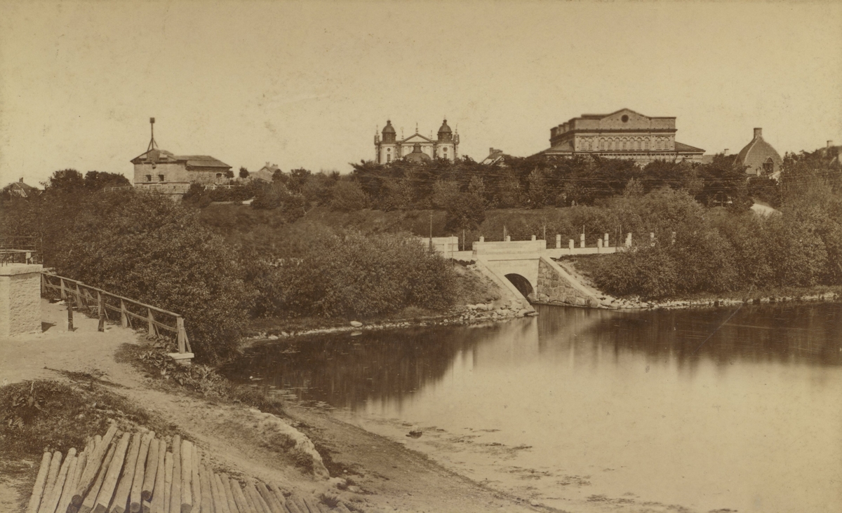 Vy från nuvarande Stadsparken mot Kvarnholmen. Från vänster ses Västerport, Domkyrkan, Teatern och taket på det så kallade Kommendanthuset eller Kockska huset.