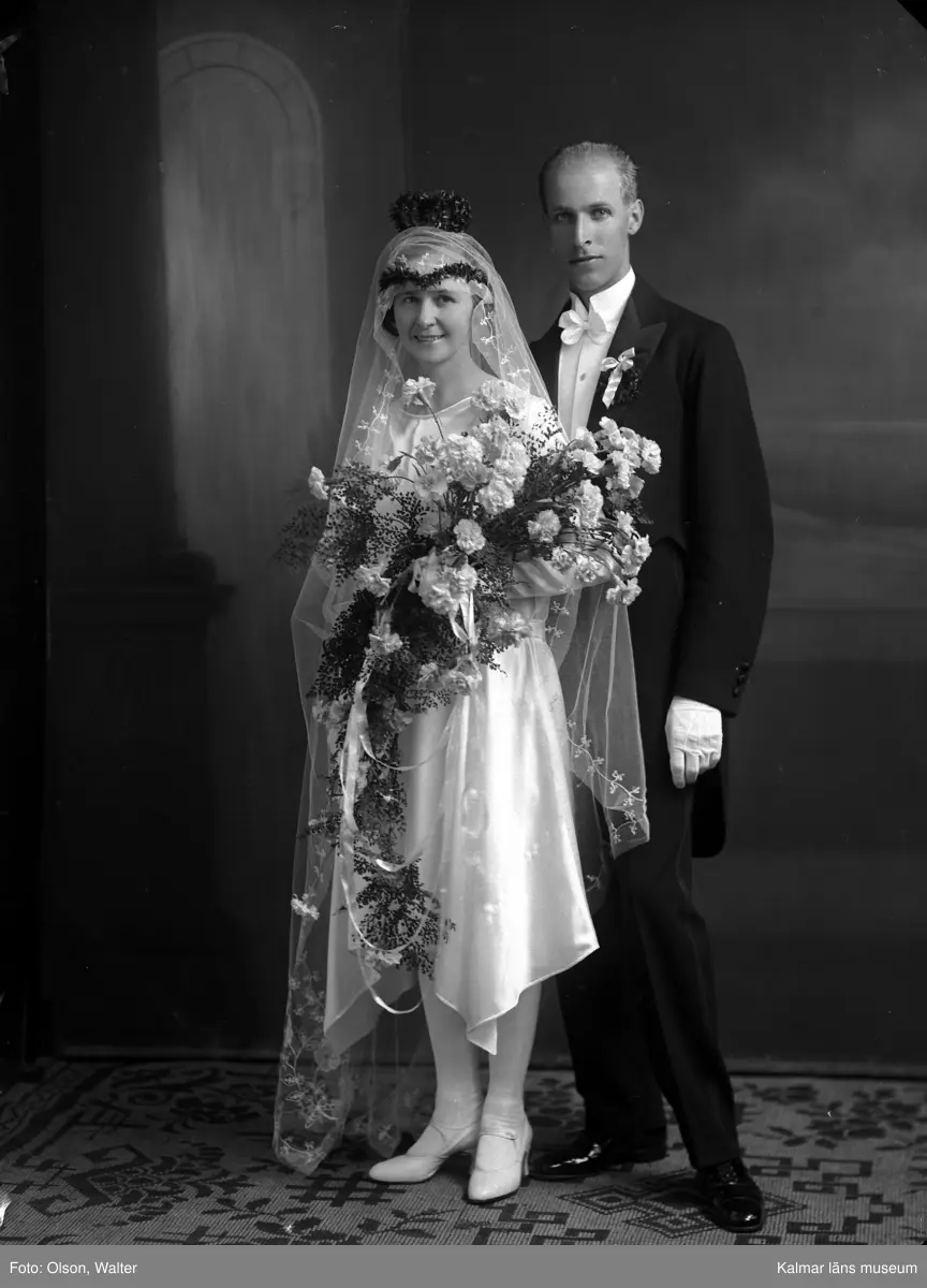 Bröllopsfoto av ett par. Kvinnan bär på en blombukett och har slöja. Mannen har frack. Enligt Walter Olsons journal är bilden beställd av herr Arthur Ingulf ifrån Gnesta. Kalmar läns museum känner inte till om det är den personen som är avporträtterad.