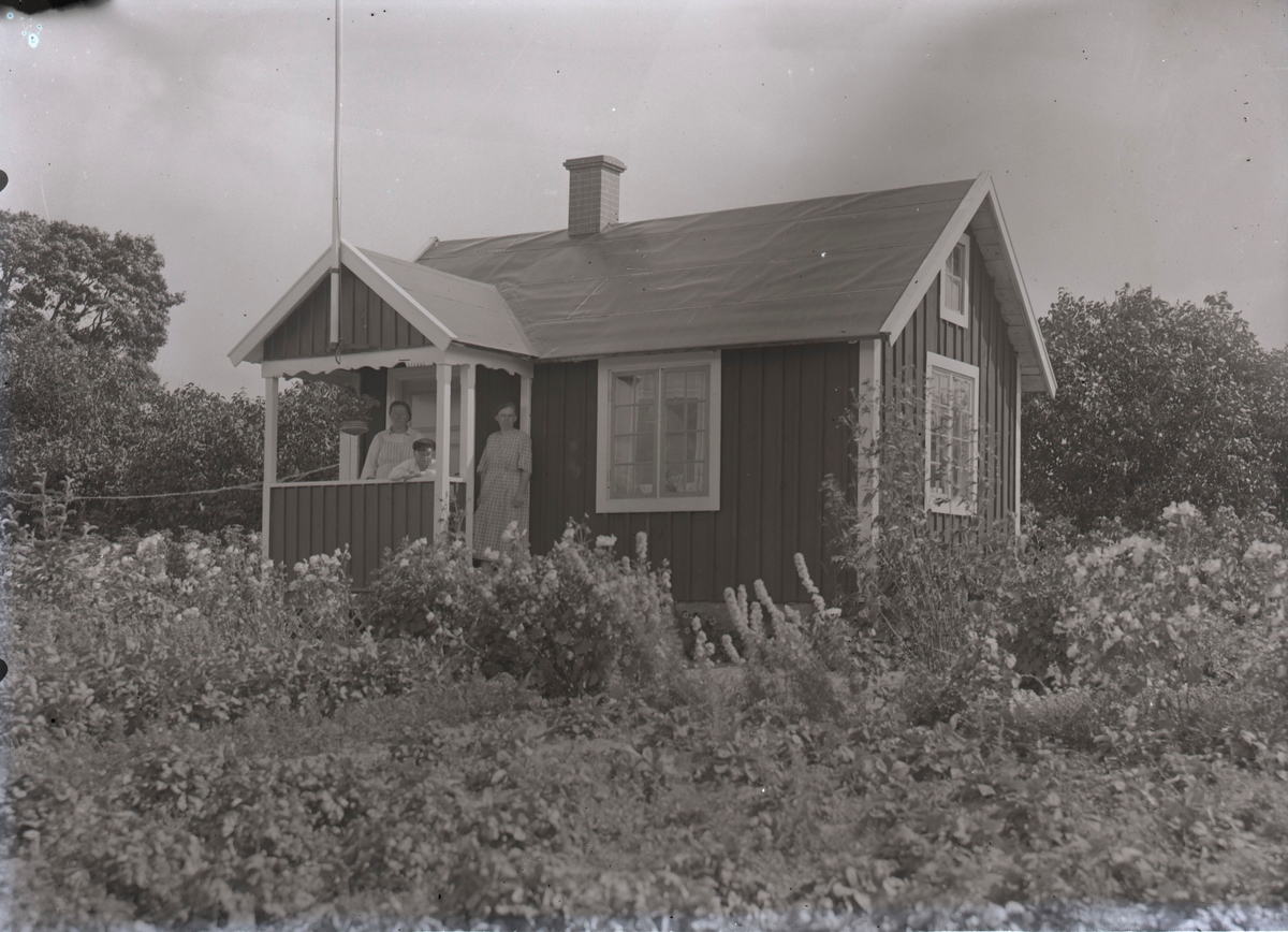 En stuga, två kvinnor och ett barn i Kalmar södra koloniområde, fotograferat omkring 1930. Kalmar södra koloniförening grundades 1917 och har idag 105 kolonilotter. Området ligger strax söder om länssjukhuset i Kalmar med huvudingång från Stensbergsvägen.