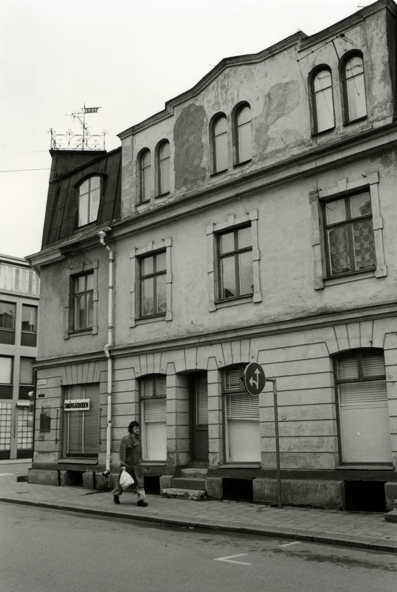 Byggnad med takkupor och takbalkong med vindflöjel. På vindflöjeln står det 1907. I bottenvåningen finns butiker och frisör.