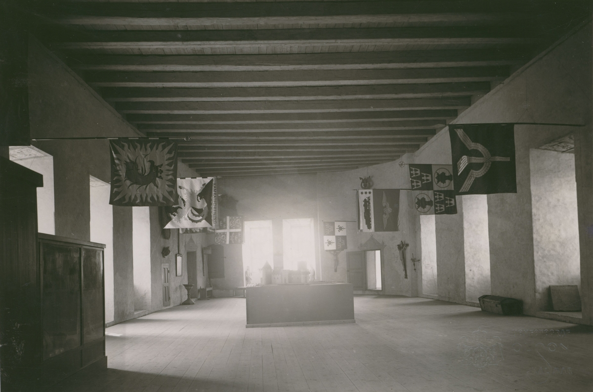 Interiör från Kalmar slott, Gröna salen, rum 87. Konstnären Einar J:son Kedjas separatutställning på Kalmar slott 1-13 augusti 1942. Fanorna.