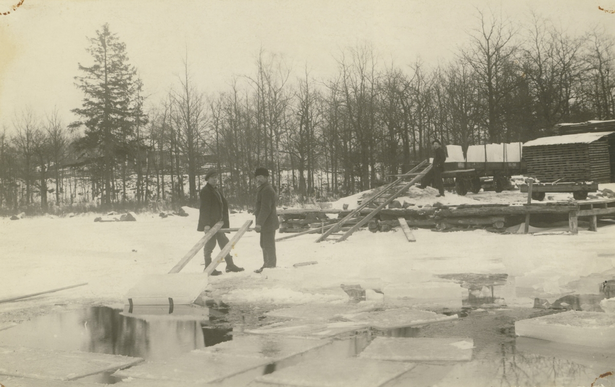 Upptagning av is i Alsterbro på 1920-talet. Isen packades sedan under tjocka lager sågspån och höll sig där till nästa vinter. Allt eftersom tog man fram och fyllde på i isskåpen så maten höll sig färsk.