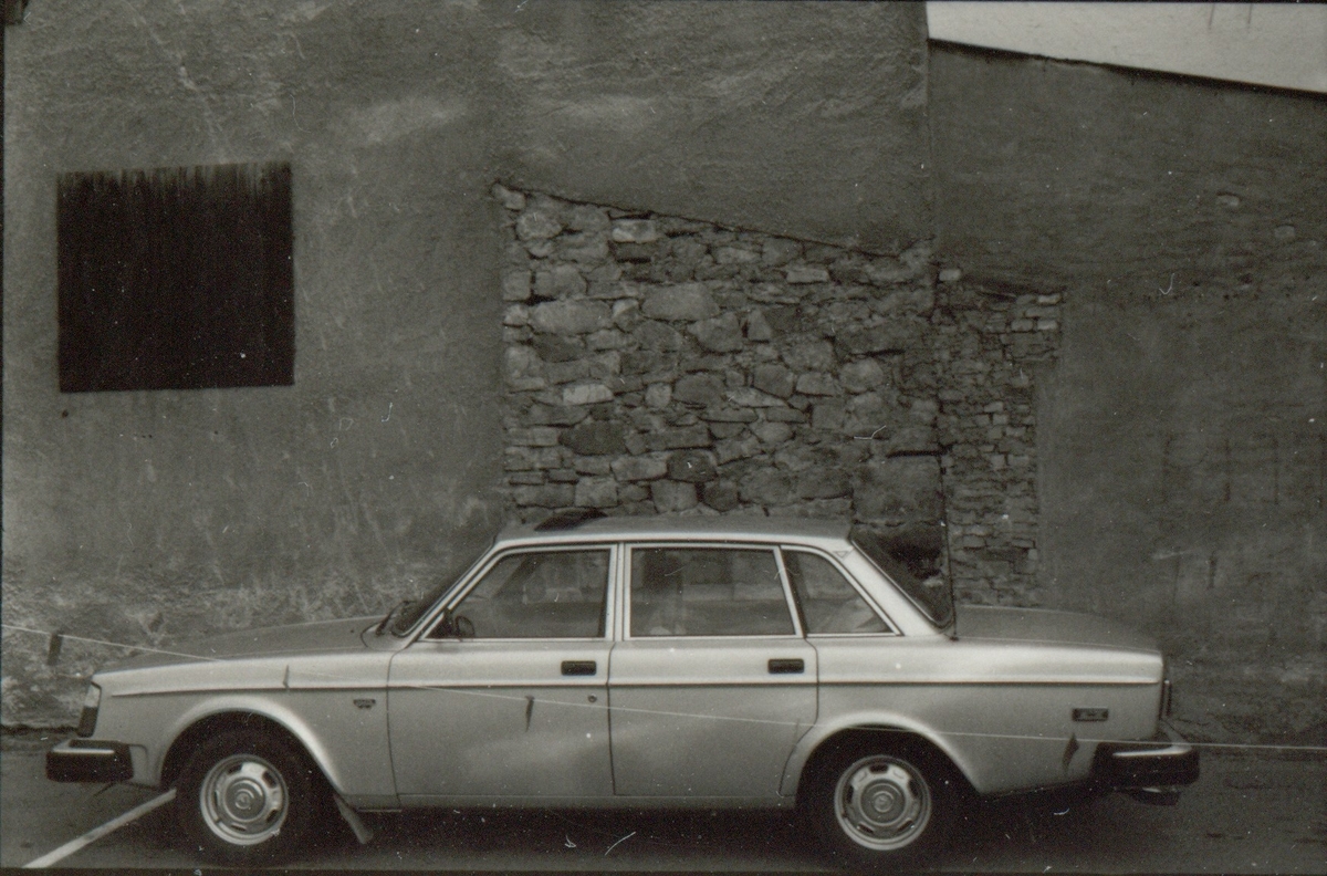 Volvo 244, parkerad intill muren vid kv Gesällen.