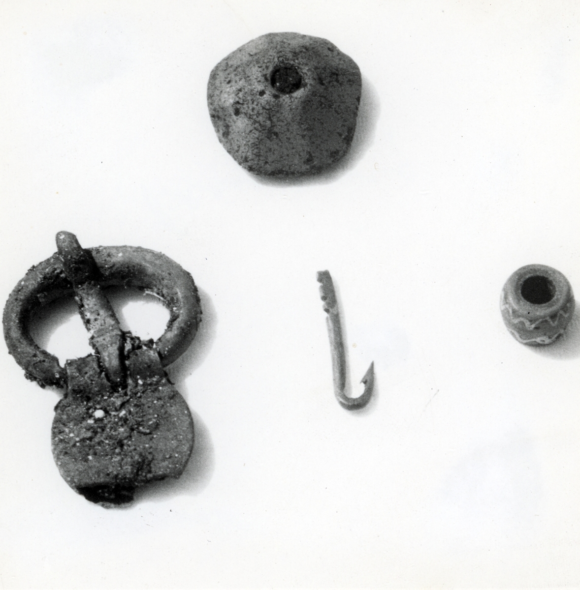 Fynd från Skedemosse, bland annat metkrok och ett spänne.