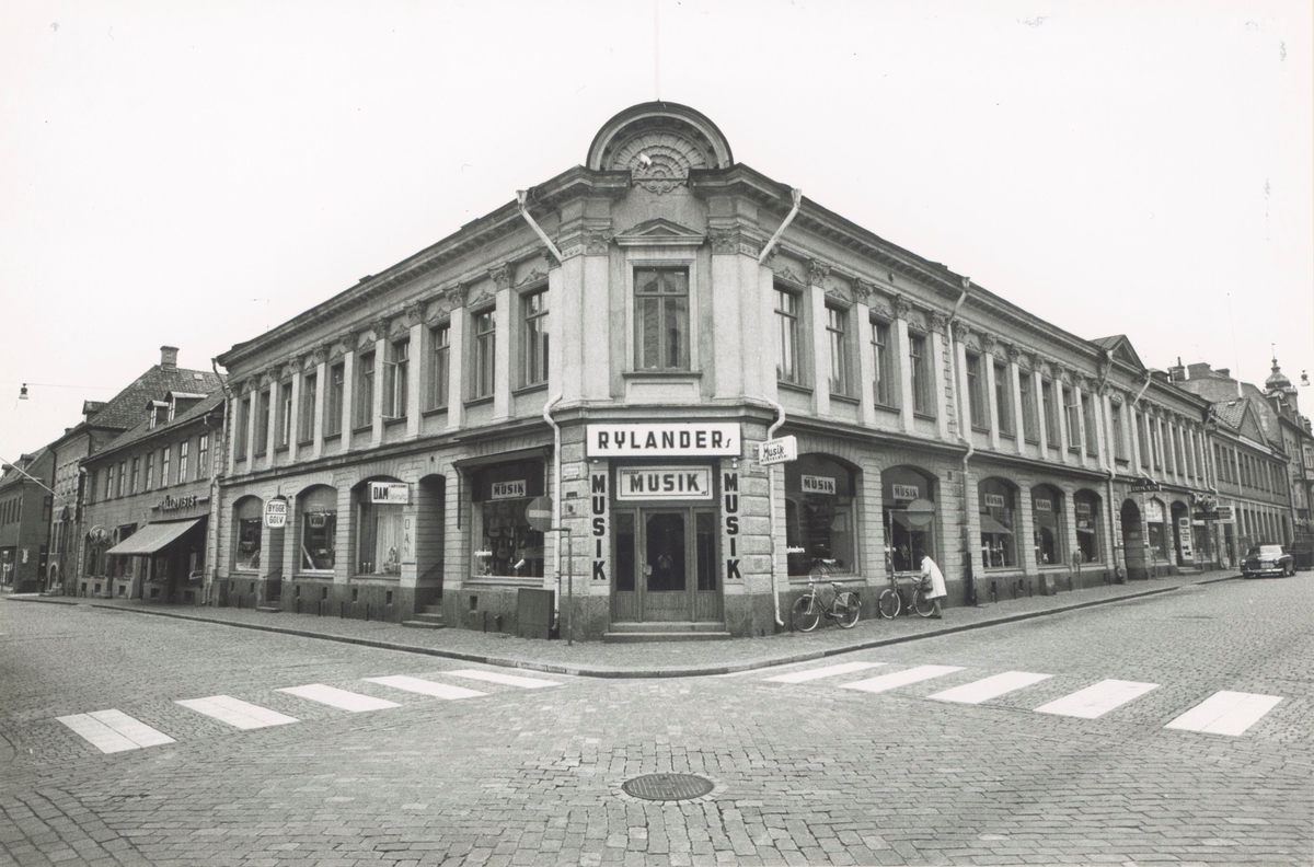 Rylanders musik, fasad mot Södra Långgatan-Kaggensgatan väster om Västra Sjögatan. Affären grundades 1969 av Ingvar Rylander.