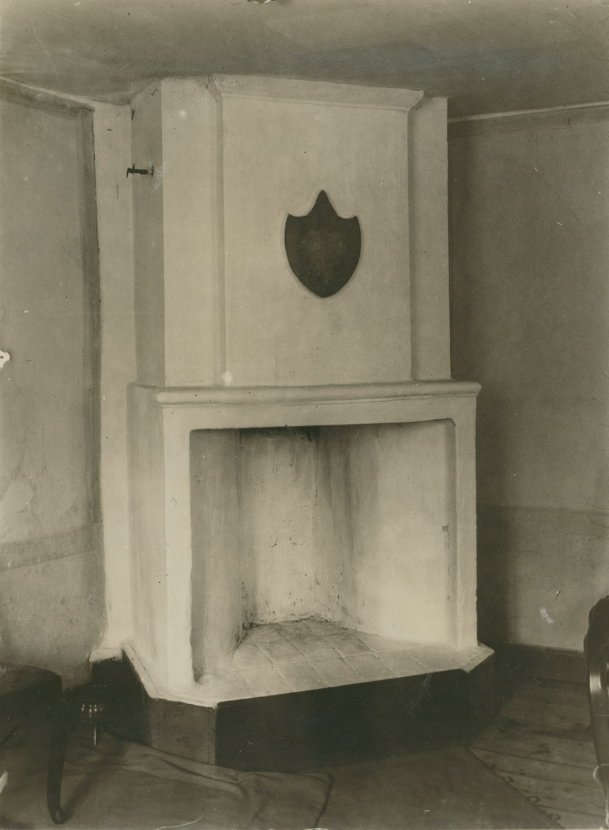 Spis i rummet till höger i förstugan, murad, vitlimmad. På spisens bröst en inmurad sköldformig platta av brunmålad sten. På plattan är klistrat ett vapen av papper i grå färger, troligen slitet.