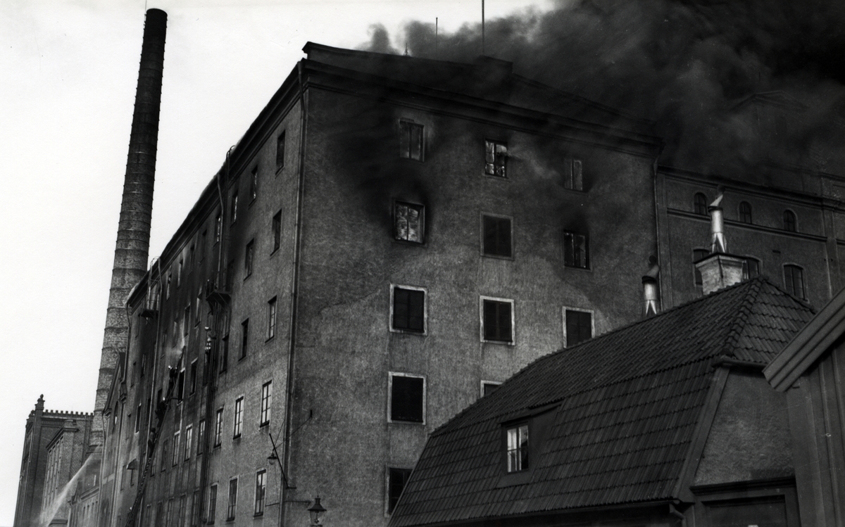 Ångkvarnen i Kalmar. Branden juli månad 1935. På denna bild syns konturerna av den i kvarnen inbyggda 1600-talsbyggnaden.