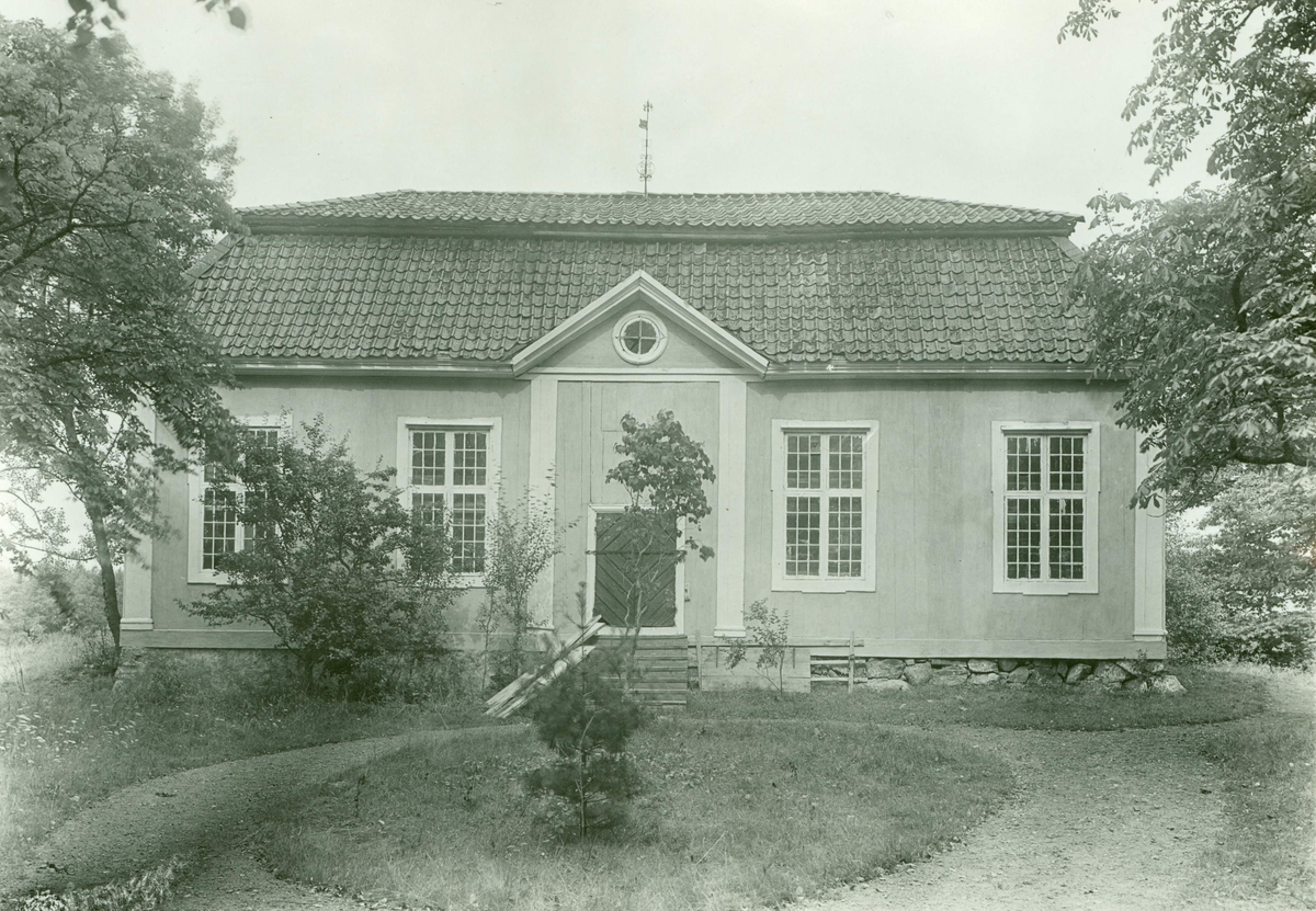 Timmer slätpanelade gulmålade väggar med foder, pilastrar och lister i vitt. Taket med gammalt svart tegel. Rikt smidd flöjel med årtalet 1774.