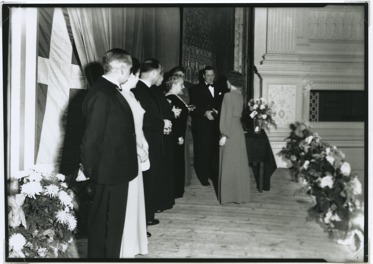 Konsul Ivar Berggren räcker handen åt anställd dam.
