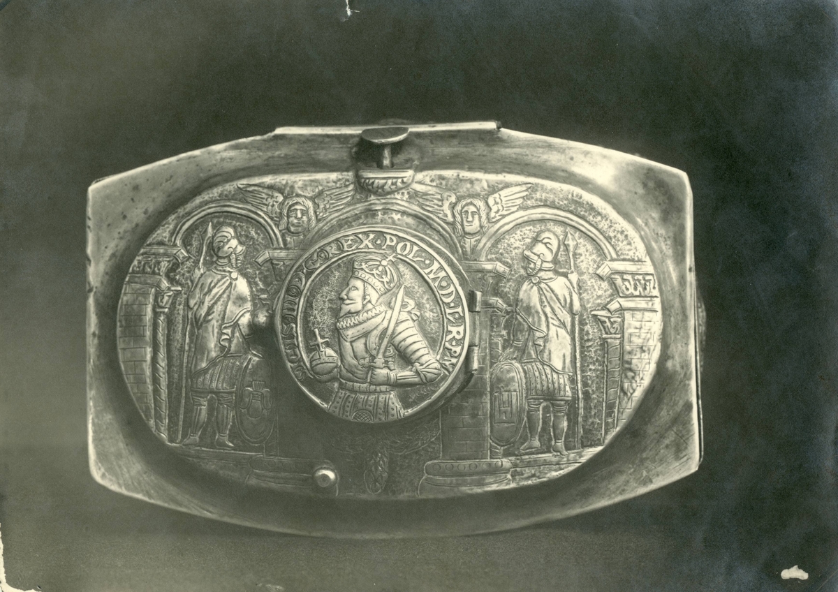 Lock till ett silverskrin, locket till gömman gjort av ett silvermynt.