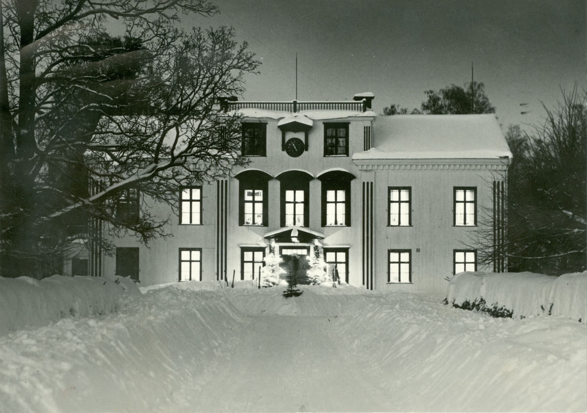 Bostadshus omgivet av snö, med frontespis och putsad fasad.