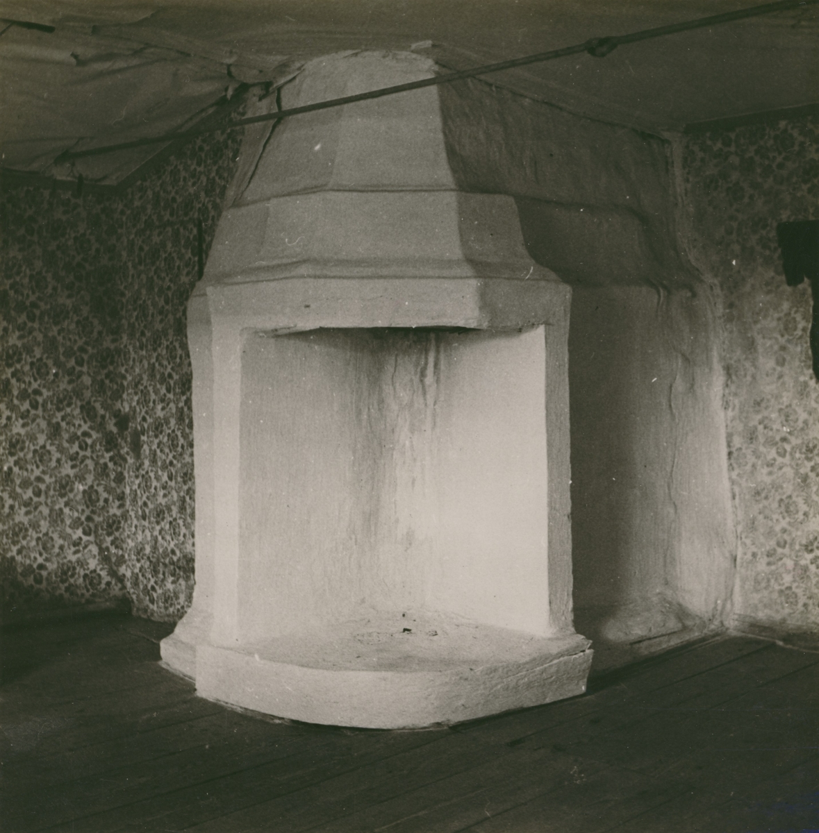 Interiör med putsad spis och vägg.