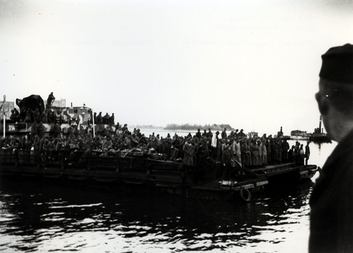 Tysk landstigningsbåt i Kalmar hamn i maj 1945. De baltiska soldaterna i tysk uniform kom från ett brohuvud i Baltikum dit de drivits av Röda armén. När de kom till Kalmar upprättades ett läger på Kullö. Senare fördes de till bl a Eksjö.